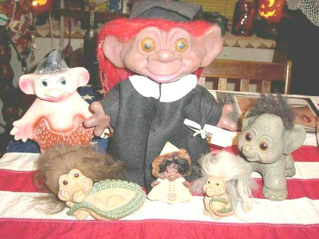 Hey Hey Hey. Yes you are looking at some super kewl black trolls above. The four larger trolls in the back are by russ and are new. The smaller two trolls on the left are vintage Dam trolls marked "dam original" on their backs. These two three inchers are mint in their original costums. It took me 5 years to find vintage black dam trolls. The small troll in the middle is a treasure troll (newer). And lastly the small troll on the right is an unmarked tab troll made in the sixties. Prices for the small Dams are $125+ or more for each. The newer black trolls can still be bought. The tab troll is worth about $50.