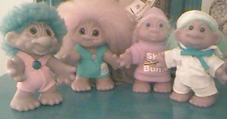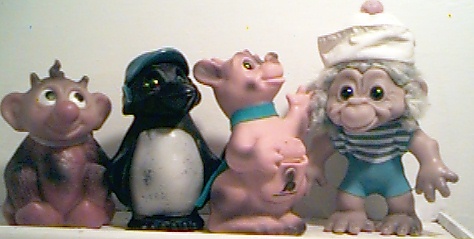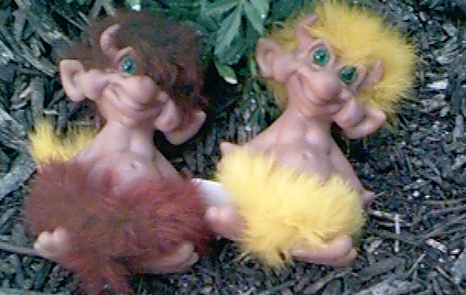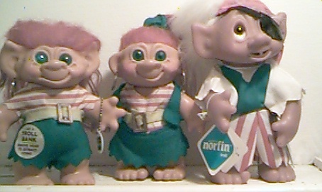The trolls below have been called many different things over the years. They are reffered to as the 520 style, 522 style, little brother and litle sister trolls. They are all made by the Dam company. There are (as far as I know ) twelve differt face styles for the femal version and twelve diferent face styles for the male version. These molds have been around for quite some time. The older style, and the ones produced in denmark have mostly mohair and felt outfits with little buttons on their front. They are a bit more costly. i paid about fifty dollars each for them. The newer styles have synthetic hair a a large variety of outfits. Some were made in china to be sold in the States and are thus marked "made in China DAM". The older ones are just marked "TH DAM Design". This mold has been used many times for different endeavors. The norfin line imported them also. The totally troll line also used this mold. Notice the trolls in the right hand picture below. the two on the left are older versions and the two on the right are newer versions dressed as a ski bum and sailor. I like the girl in the middle because she has a tag tha reads 'trold" on her dress. Trold is a forien word for troll.