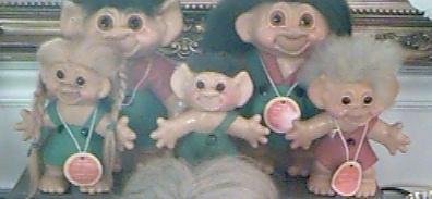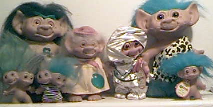 Hey Hey Hey. Yes you are looking at some super kewl black trolls above. The four larger trolls in the back are by russ and are new. The smaller two trolls on the left are vintage Dam trolls marked "dam original" on their backs. These two three inchers are mint in their original costums. It took me 5 years to find vintage black dam trolls. The small troll in the middle is a treasure troll (newer). And lastly the small troll on the right is an unmarked tab troll made in the sixties. Prices for the small Dams are $125+ or more for each. The newer black trolls can still be bought. The tab troll is worth about $50.