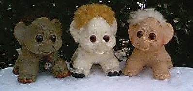 Please note: I am not sure if the small moongoon wearing a dress is an original costum or not, although I have seen the cave man outfit on another MIB moonie so I think at least the cave outfit is orignial. The two large moongoons are in original costume. |