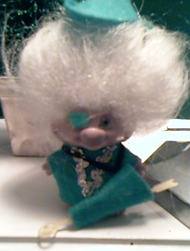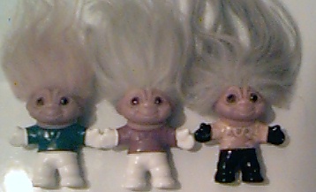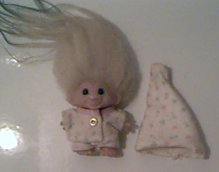 Below is a three inch Dam troll with blond hair and blue eyes. Trolls with blue eyes are very rare compared to the standard brown, gold and green. This troll is dressed in her bedtime clothes. To cute to be a troll, yuck! The tips of her hair are darker in color than the rest of the hair.