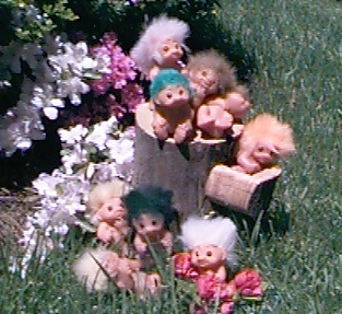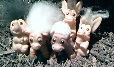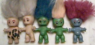 People are reffering to these trolls as "moon" trolls. They are marked 1964 L. Khem/ PAT Pend. on their feet. They have a flap on their backs. This flap has been referrred to as a "flat peanut" by some of the troll books. Some came dressed. The guy on the left is dressed as a caveman. I beleive it's original because I saw another one like this in a clear unopened container. Doesn't seem to match though, an alien in a caveman suit?? They also come in a larger size (not pictured). They are sought after by troll collectors, especially the large ones. I do believe that some of these were sold with a wand with a moon on top. It would be nice to know more about them but at the time this is all I know (Bad Goblin King).