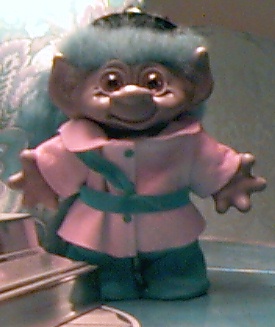 the troll on the left is wearing a viking costume. He is newer and can still be bought. The guy next to the left is an old time favorite of troll collectors. He is marked "DAM THINGS C 1965" these trolls have sold for various prices over the years. I got him for 50 dollars, but I have seen them sell for over two hundred. If you find one mint with a tag (red plastic wrist tag) or one still in it's box the price will go up. Now the next two guys are called Bjorn and nute! As you can see Bjorn has the same face as the vintage one and nute just has a different face mold but the body is the same. Bjorn and Nute are slightly smaller than the original and are new. Interestingly although they are new they still bare the date "c1965 Dam Denmark" on their left foot. Non troll collectors might think these two new trolls are vintage but they are not. They are however, still very kewl and an instant trophy for your collection.